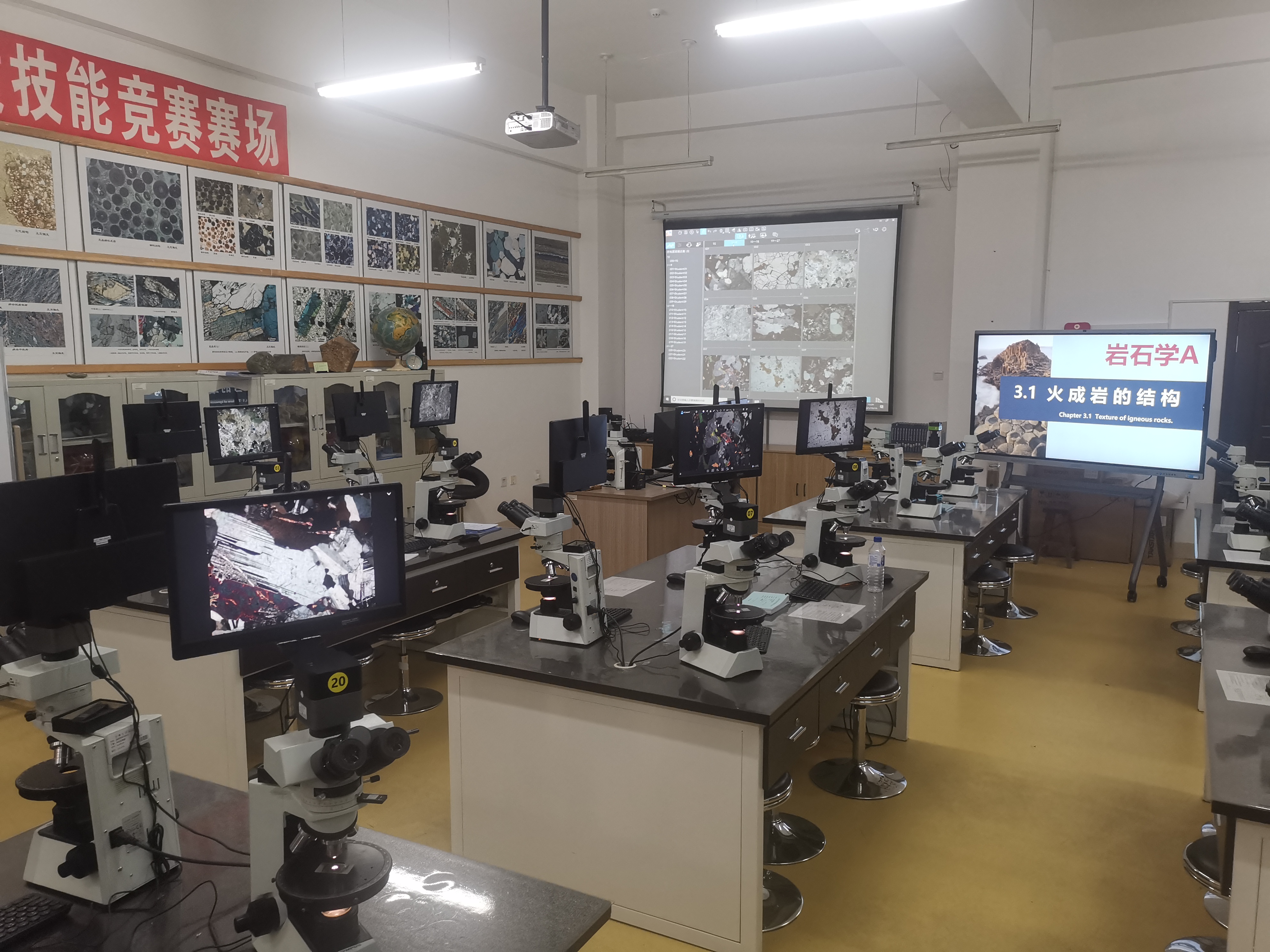 在教研室及中心共同努力下, 2019年项目经过多轮调研、论证通过立项,先后利用中央高校改善基本办学条件专项(2021)资金70.61万、国家中长期贷款项目(2022)资金89.43万,共完成2个实验室50台套显微镜的升级改造工作(教师端2套,学生端48套),初步完成岩石学智慧实验室的建设工作。下一步将积极推进矿相学实验室的升级改造。